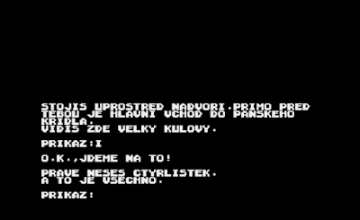 Z příkazů tu najdeme PROZKOUMEJ, VEZMI, POLOŽ, POUŽIJ, DEJ, NAPLŇ, OTEVŘI, ČTI, O (opětovný popis obrazovky) a I (inventář). Slova se zkracují na první tři písmena bez diakritiky a počet předmětů v inventáři je zdá se neomezený.